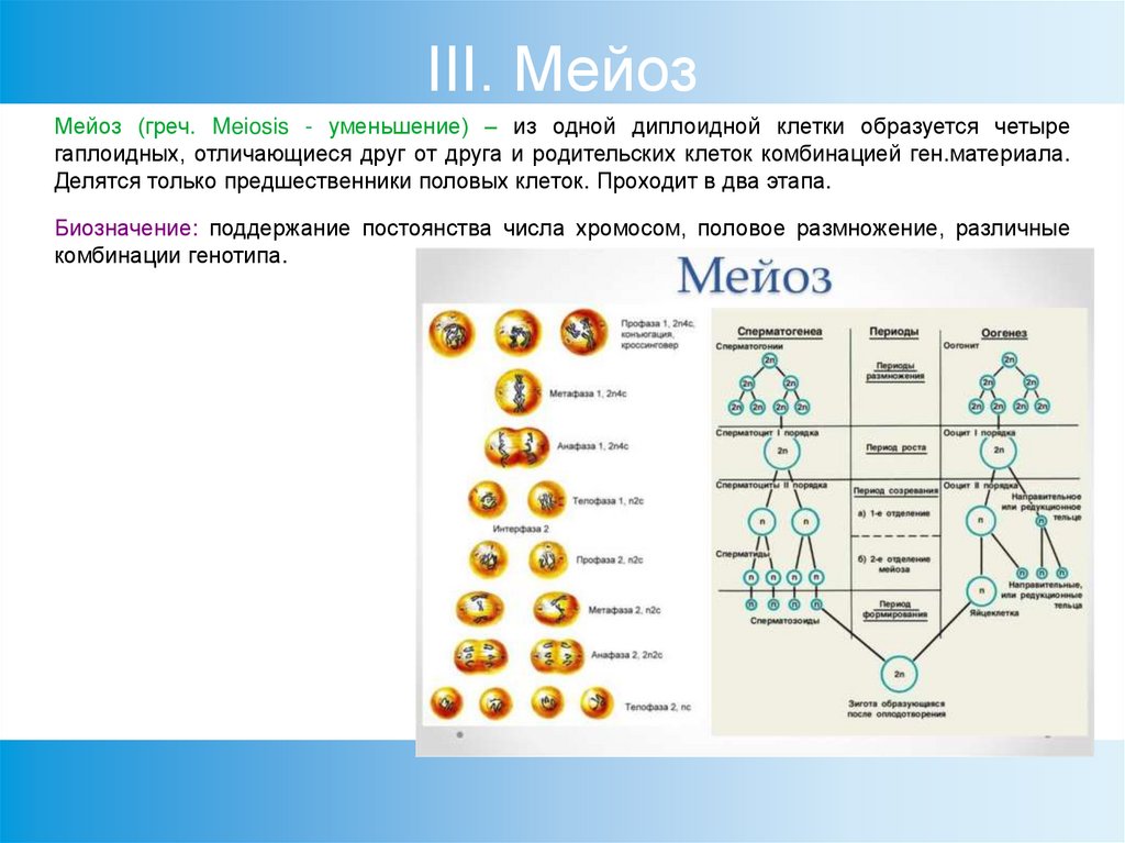 III. МейозМейоз (греч. Meiosis - уменьшение) – из одной диплоидной клетки образуется четыре