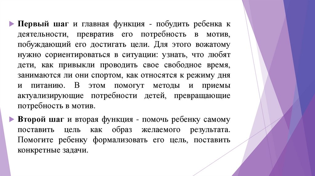Первый шаг и главная функция - побудить ребенка кдеятельности, превратив его потребность в мотив,