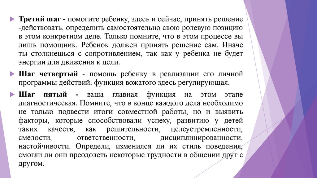 Третий шаг - помогите ребенку, здесь и сейчас, принять решение-действовать, определить самостоятельно свою ролевую позицию