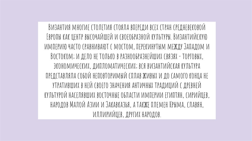 Византия многие столетия стояла впереди всех стран средневековойЕвропы как центр высочайшей и своеобразной культуры. Византийскую