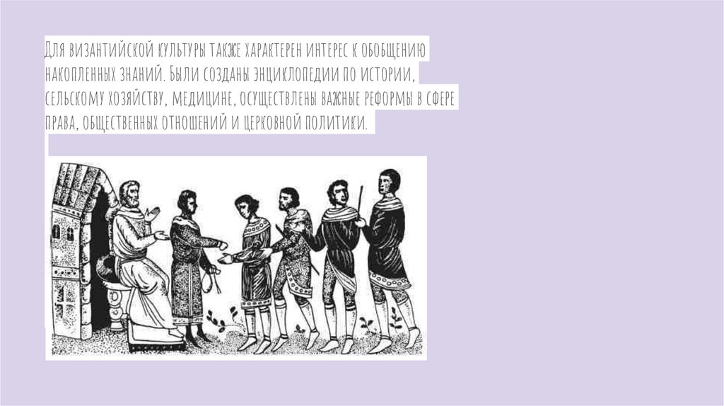 Для византийской культуры также характерен интерес к обобщениюнакопленных знаний. Были созданы энциклопедии по истории,