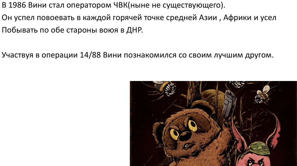В 1986 Вини стал оператором ЧВК(ныне не существующего).Он успел повоевать в каждой горячей точке средней Азии , Африки и усел