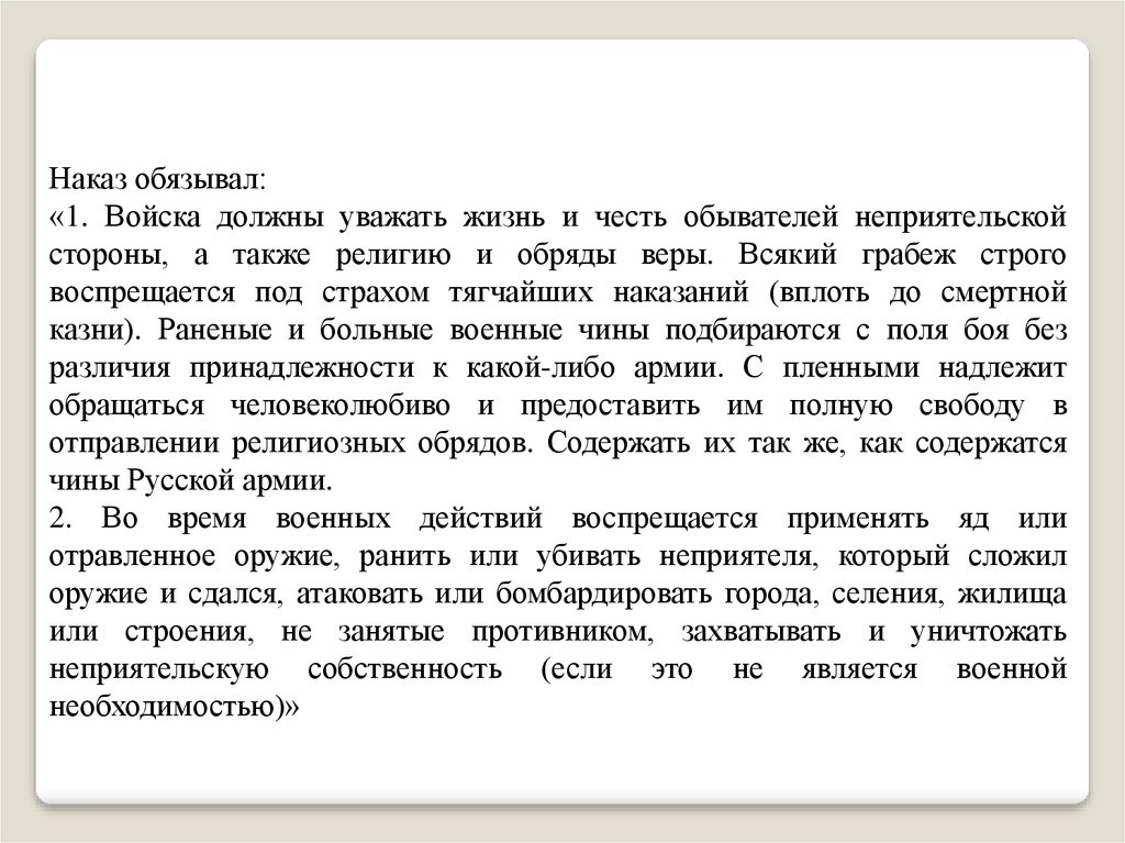 Наказ обязывал:«1. Войска должны уважать жизнь и честь обывателей неприятельской
