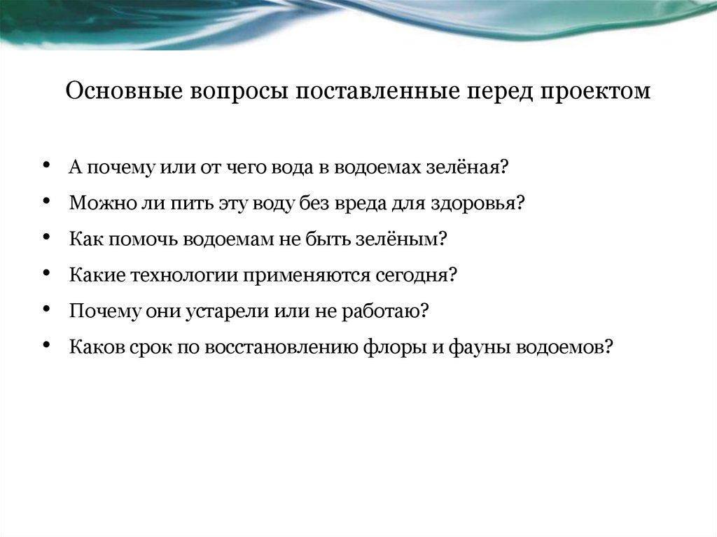 Основные вопросы поставленные перед проектомА почему или от чего вода в водоемах зелёная?