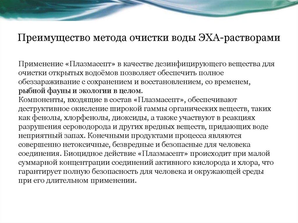 Преимущество метода очистки воды ЭХА-растворамиПрименение «Плазмасепт» в качестве дезинфицирующего вещества для