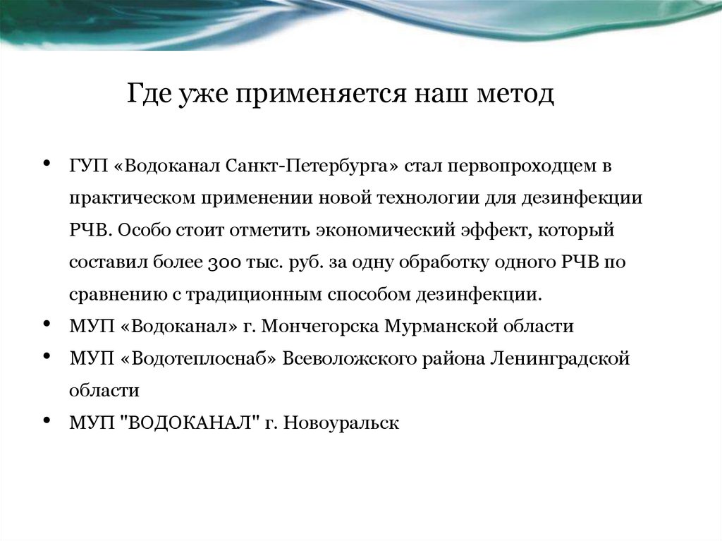 Где уже применяется наш методГУП «Водоканал Санкт-Петербурга» стал первопроходцем в