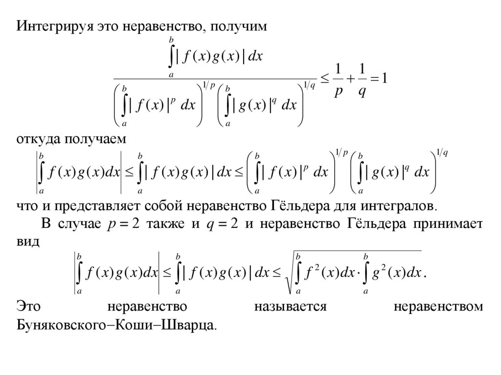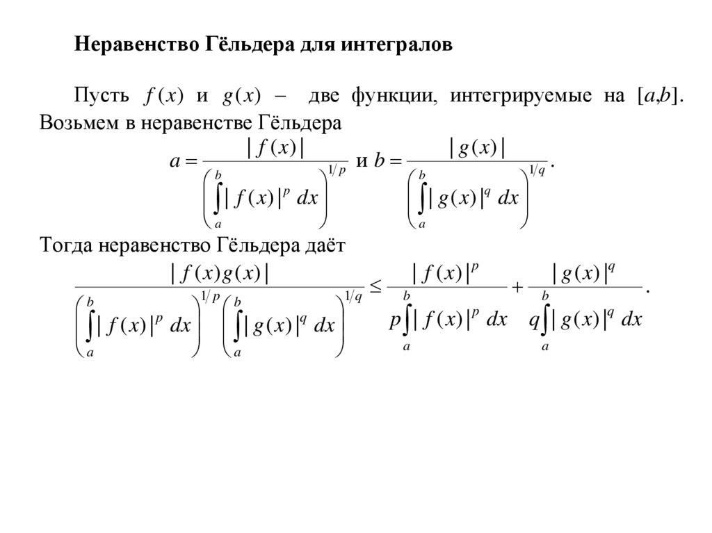 Неравенство Гёльдера для интеграловПусть f (x) и g (x ) две функции, интегрируемые на [a,b].