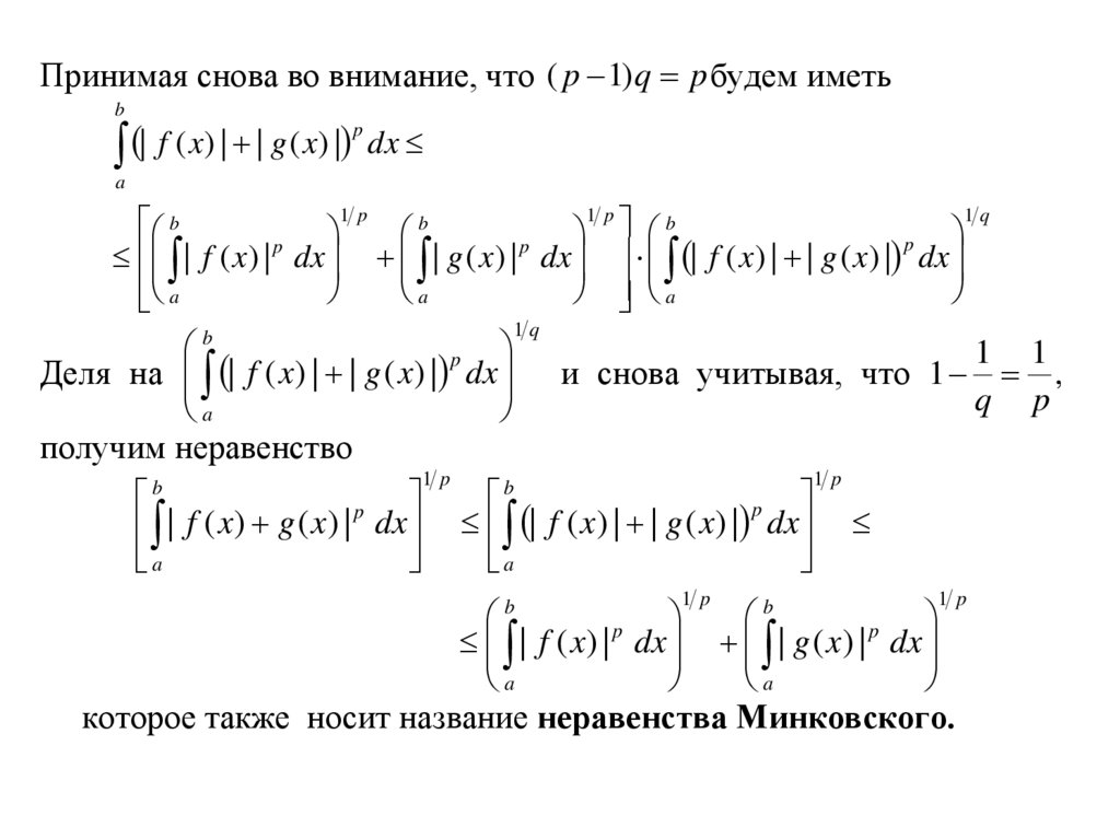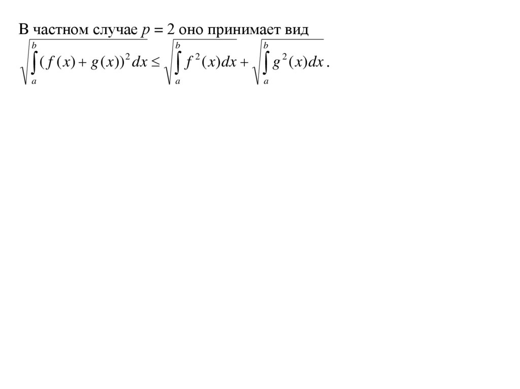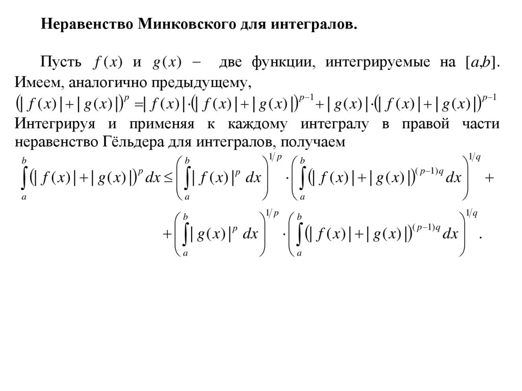 Неравенство Минковского для интегралов.Пусть f (x) и g (x ) две функции, интегрируемые на [a,b].