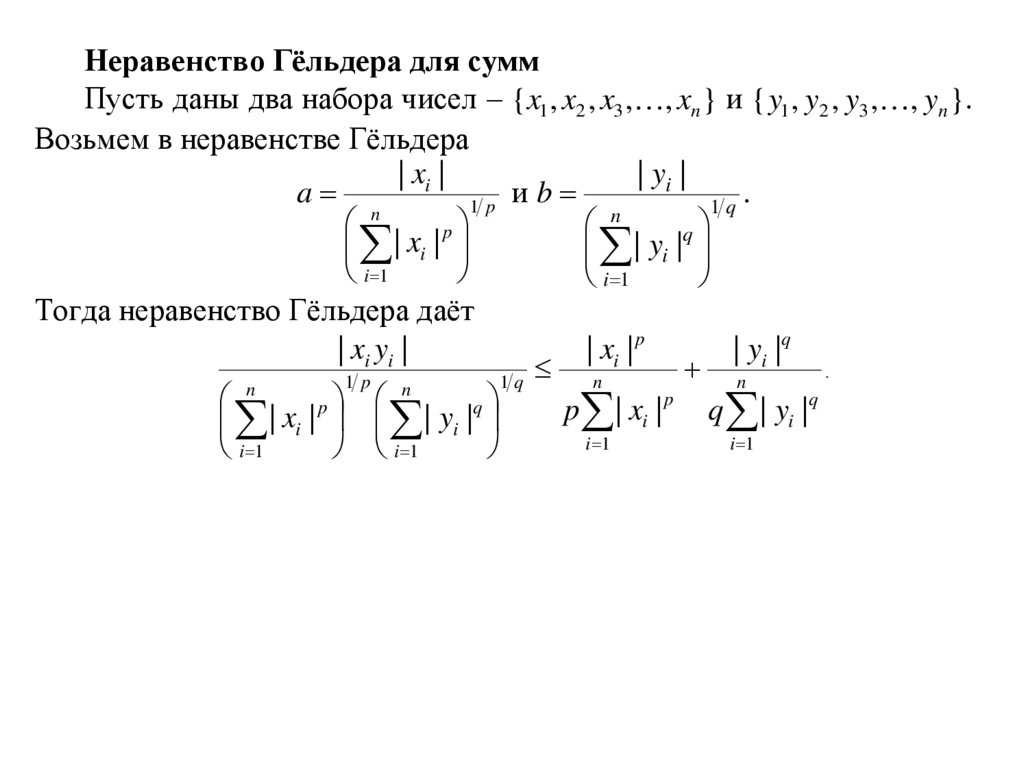 Неравенство Гёльдера для суммПусть даны два набора чисел {x1 , x2 , x3 , , xn } и { y1 , y2 , y3 , , yn }.