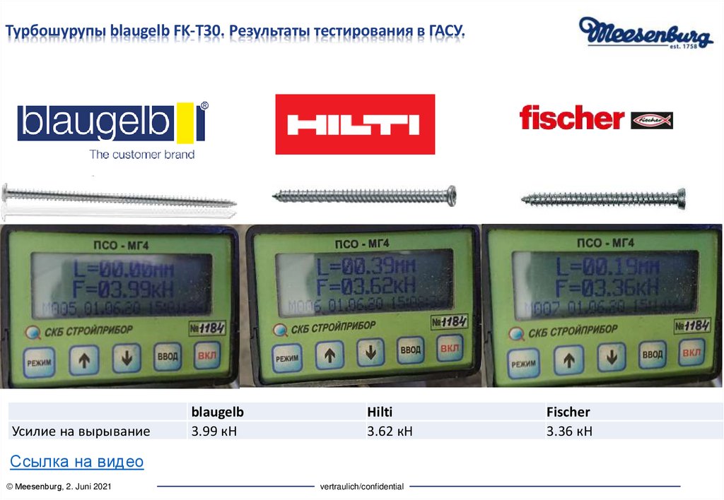 Турбошурупы blaugelb FK-T30. Результаты тестирования в ГАСУ.Усилие на вырывание