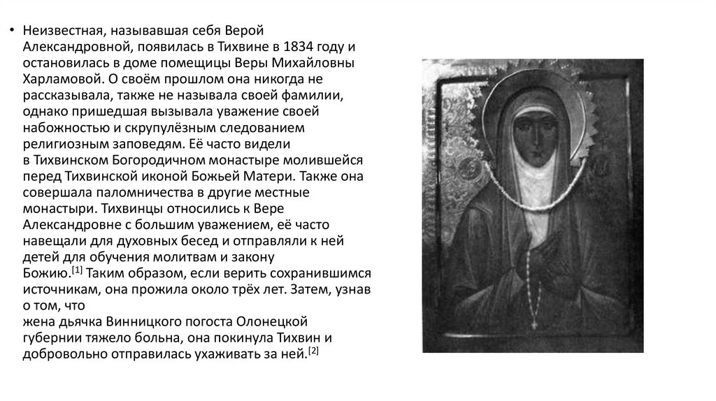 • Неизвестная, называвшая себя ВеройАлександровной, появилась в Тихвине в 1834 году и