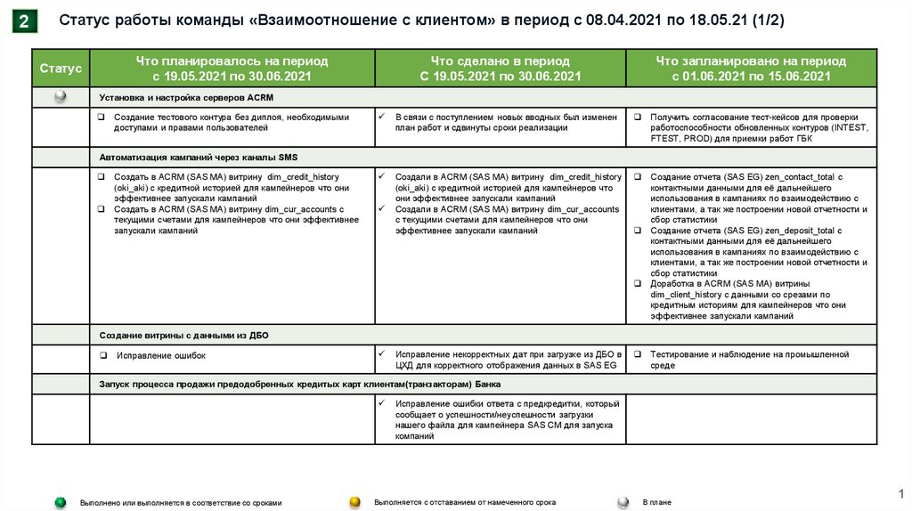 2Статус работы команды «Взаимоотношение с клиентом» в период с 08.04.2021 по 18.05.21 (1/2)