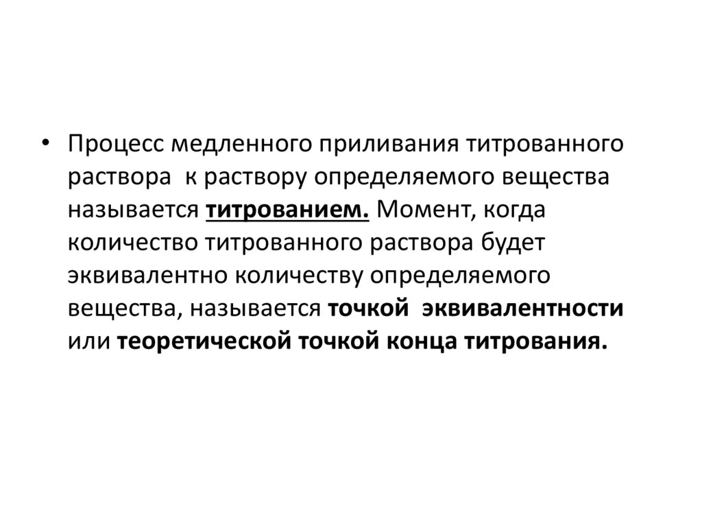 • Процесс медленного приливания титрованногораствора к раствору определяемого вещества