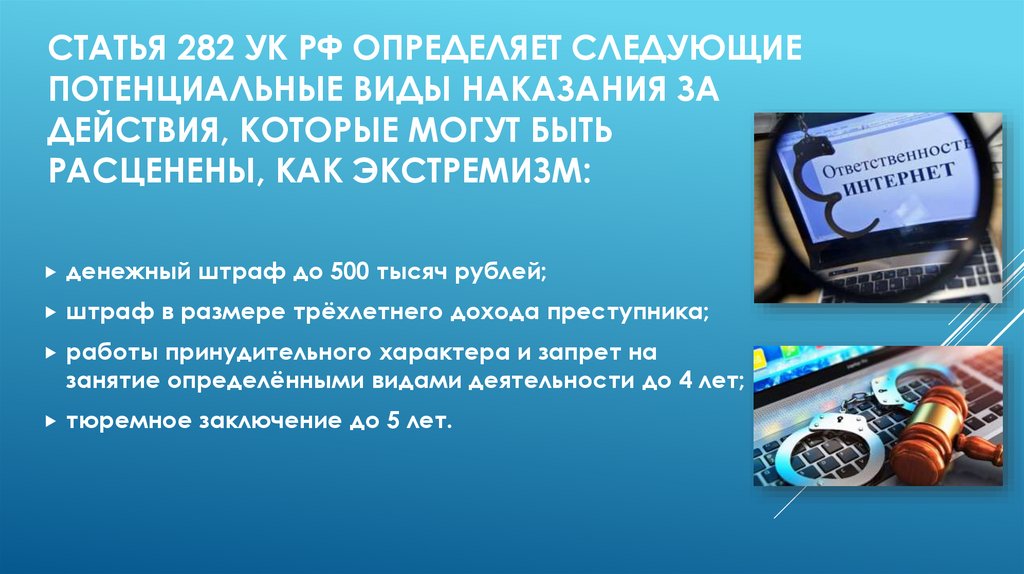 СТАТЬЯ 282 УК РФ ОПРЕДЕЛЯЕТ СЛЕДУЮЩИЕПОТЕНЦИАЛЬНЫЕ ВИДЫ НАКАЗАНИЯ ЗА