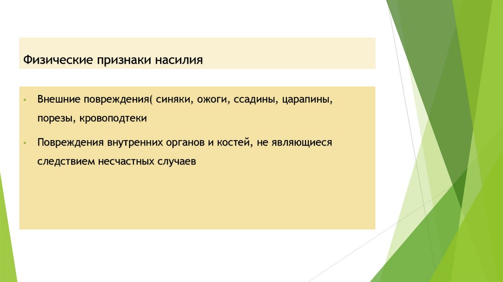 Физические признаки насилияВнешние повреждения( синяки, ожоги, ссадины, царапины,