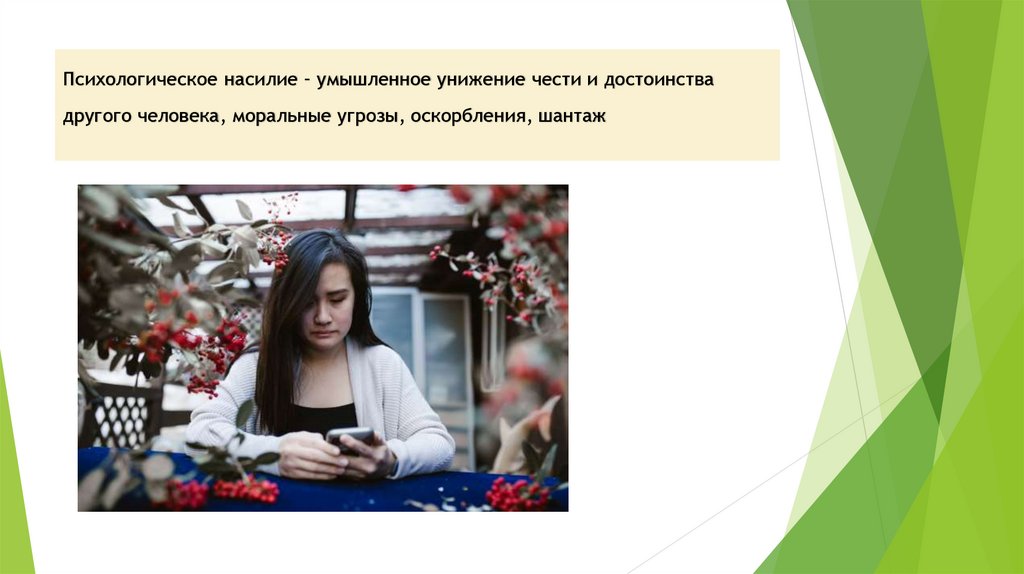 Психологическое насилие – умышленное унижение чести и достоинствадругого человека, моральные угрозы, оскорбления, шантаж