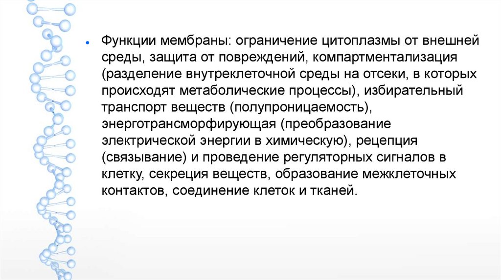 Функции мембраны: ограничение цитоплазмы от внешнейсреды, защита от повреждений, компартментализация