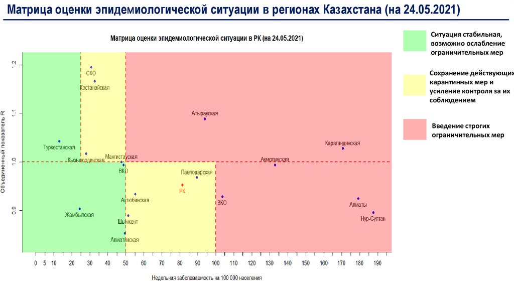 Матрица оценки эпидемиологической ситуации в регионах Казахстана (на 24.05.2021)Ситуация стабильная,