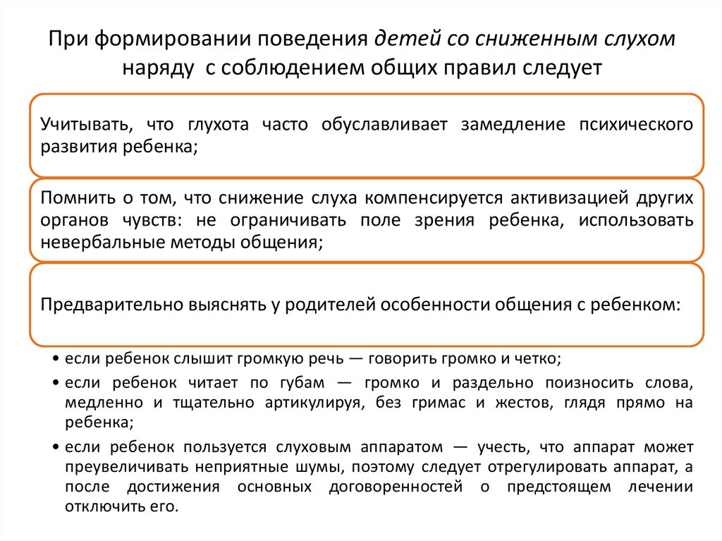 При формировании поведения детей со сниженным слухомнаряду с соблюдением общих правил следует