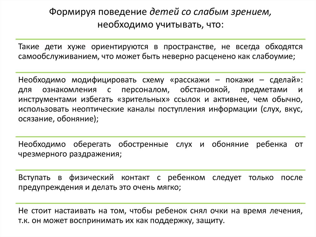 Формируя поведение детей со слабым зрением,необходимо учитывать, что: