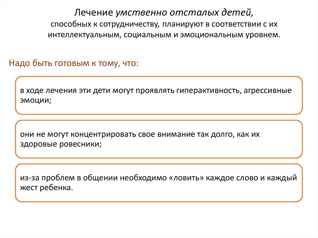 Лечение умственно отсталых детей,способных к сотрудничеству, планируют в соответствии с их
