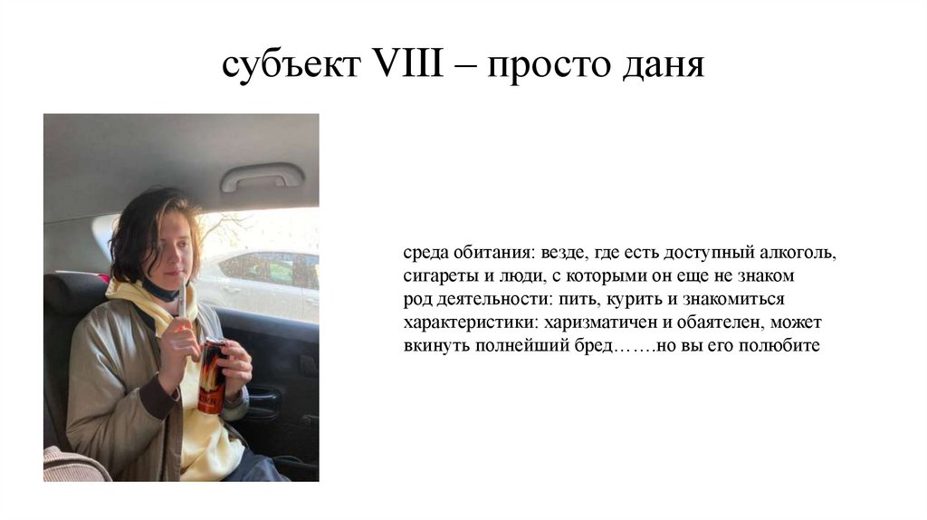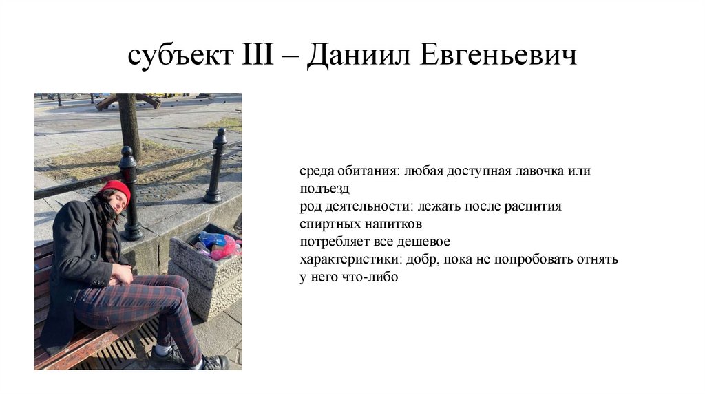 субъект III – Даниил Евгеньевичсреда обитания: любая доступная лавочка или