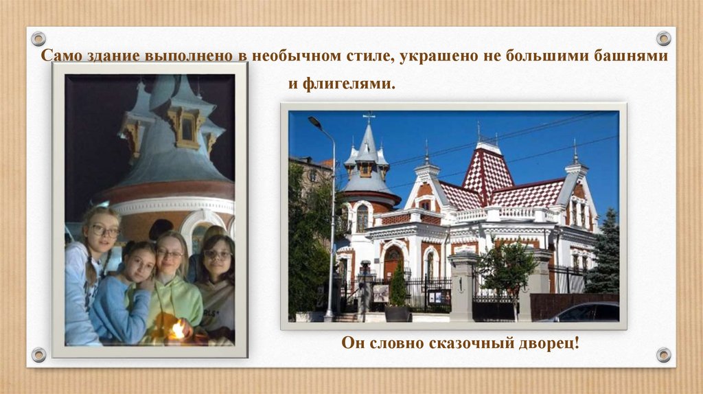 Само здание выполнено в необычном стиле, украшено не большими башнямии флигелями.