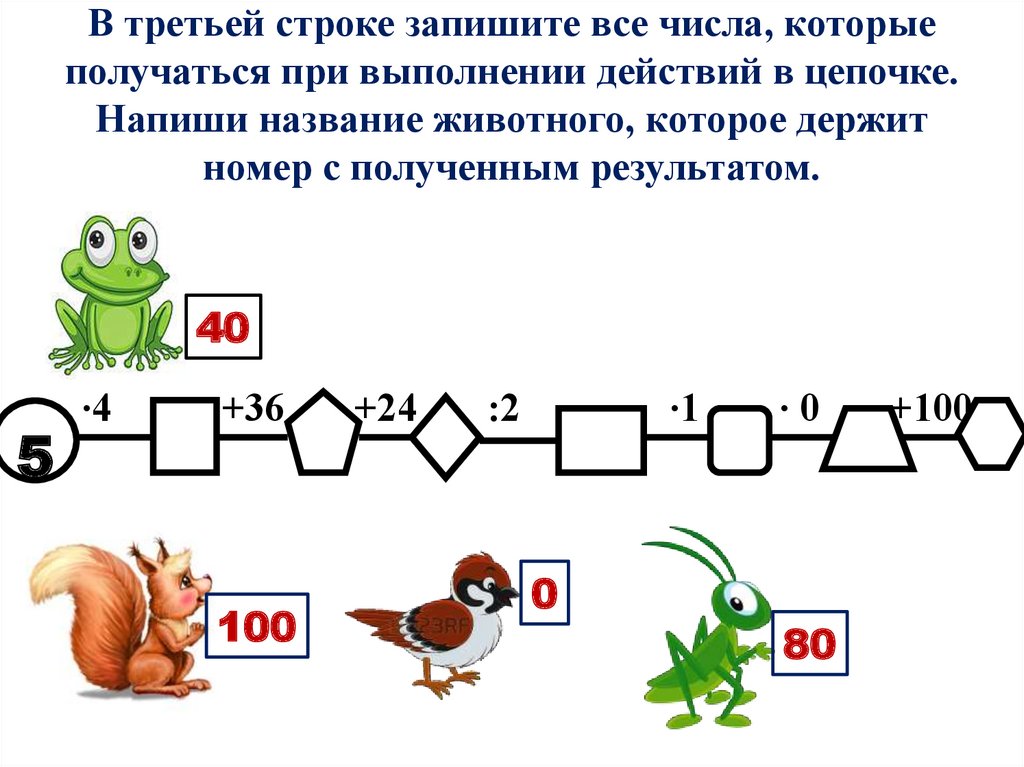В третьей строке запишите все числа, которыеполучаться при выполнении действий в цепочке.