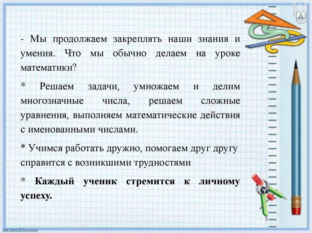 - Мы продолжаем закреплять наши знания иумения. Что мы обычно делаем на уроке