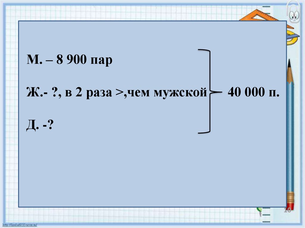 М. – 8 900 парЖ.- ?, в 2 раза >,чем мужской