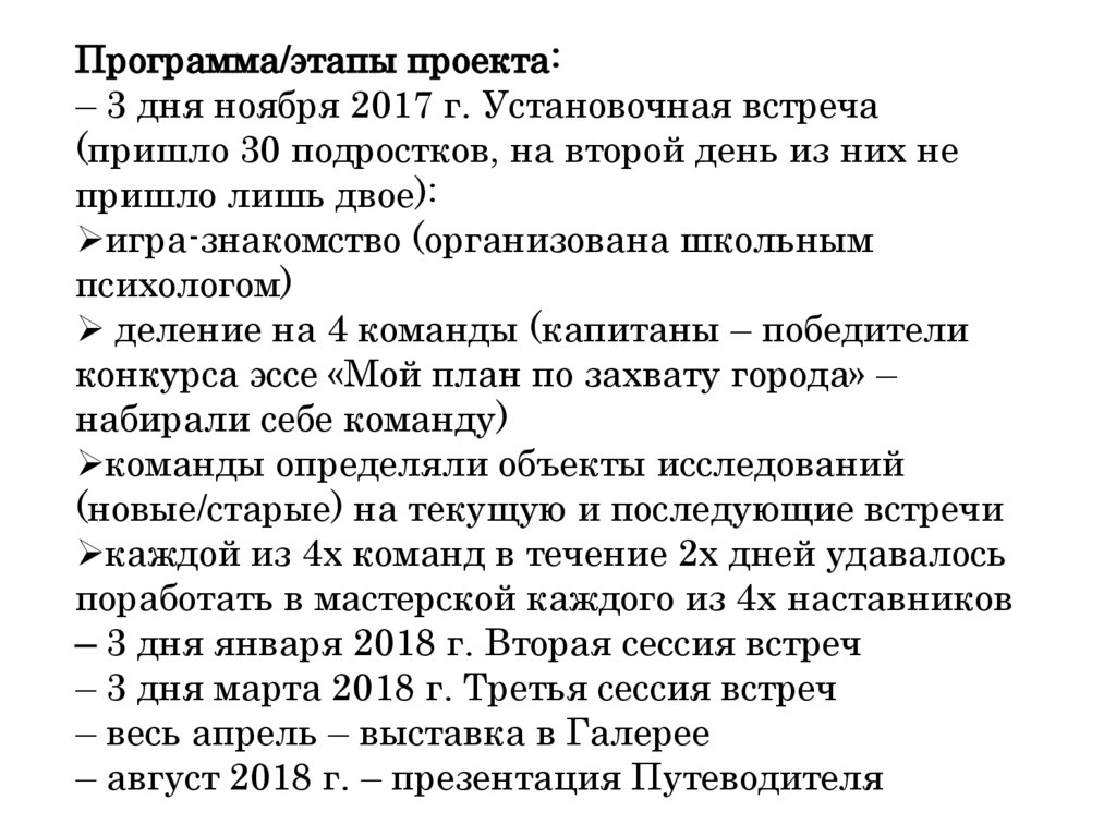 Программа/этапы проекта:– 3 дня ноября 2017 г. Установочная встреча