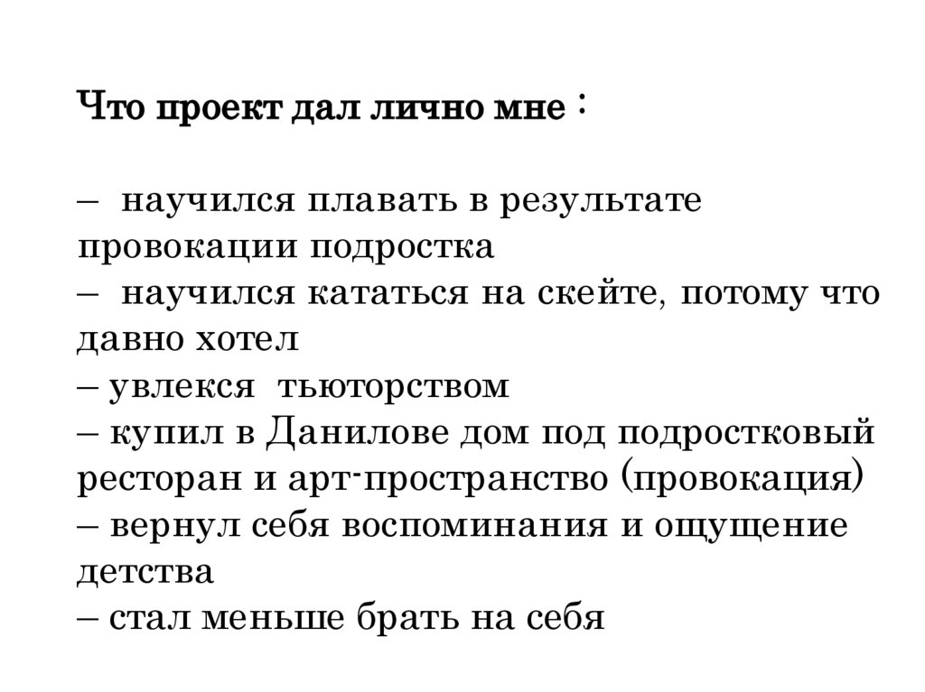 Что проект дал лично мне :– научился плавать в результате