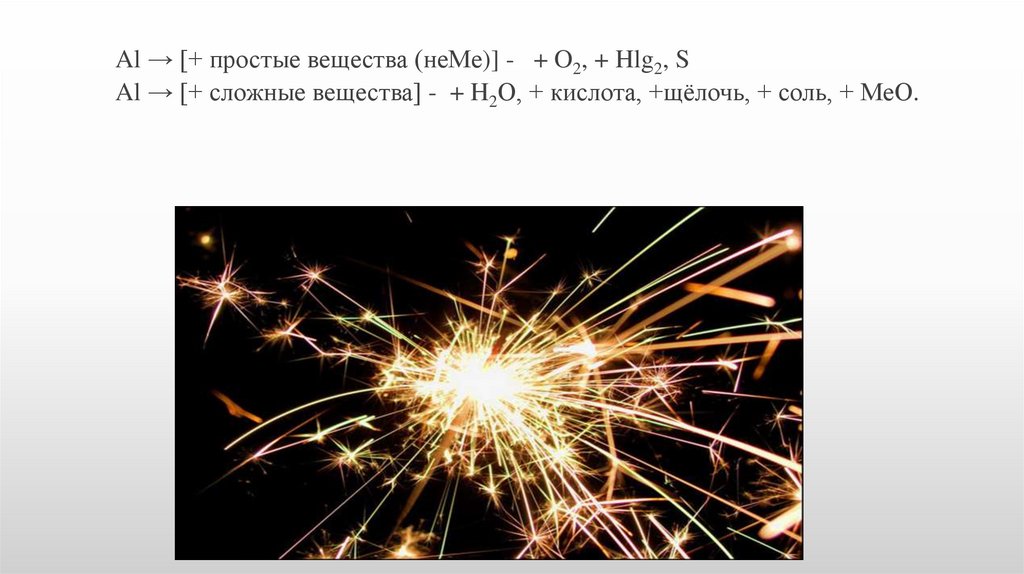 Al → [+ простые вещества (неМе)] - + O2, + Hlg2, SAl → [+ сложные вещества] - + H2O, + кислота, +щёлочь, + соль, + МеО.