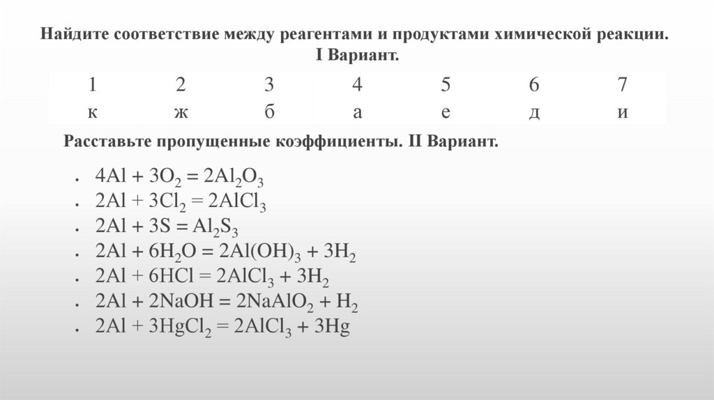 Найдите соответствие между реагентами и продуктами химической реакции.I Вариант.