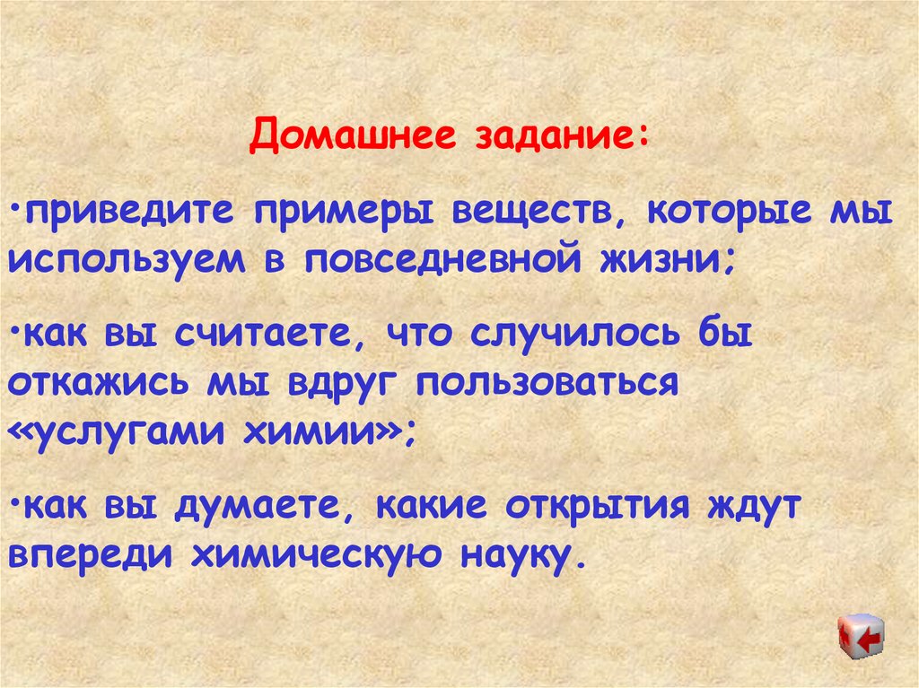 Домашнее задание:•приведите примеры веществ, которые мы