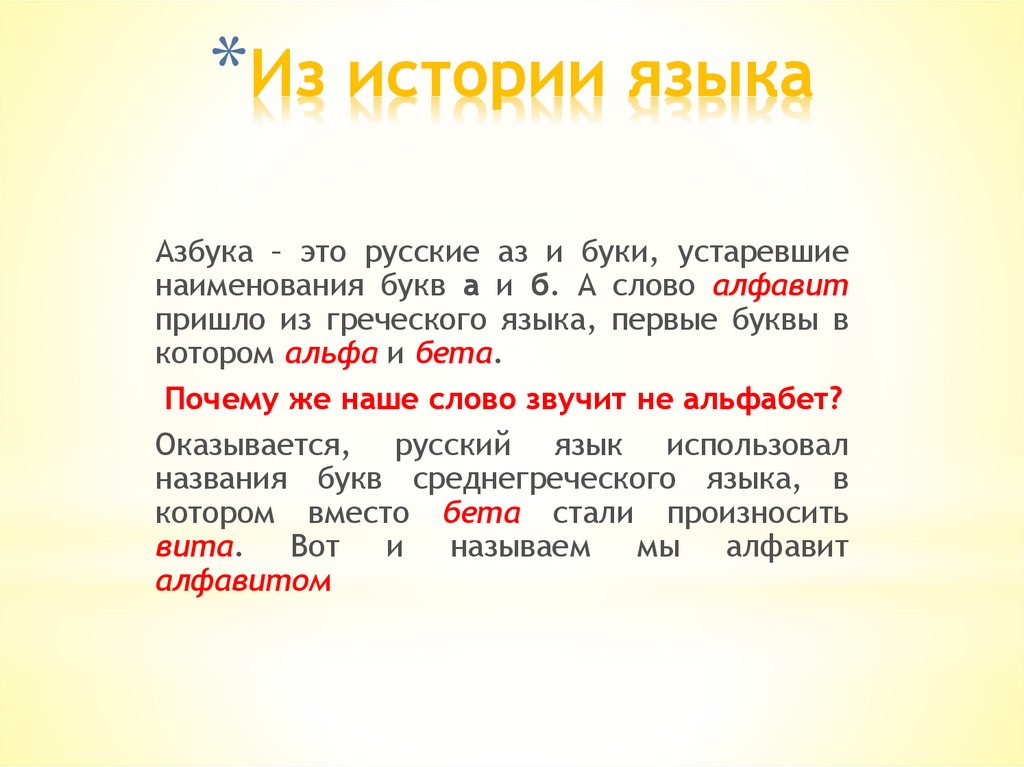 *Из истории языкаАзбука – это русские аз и буки, устаревшие