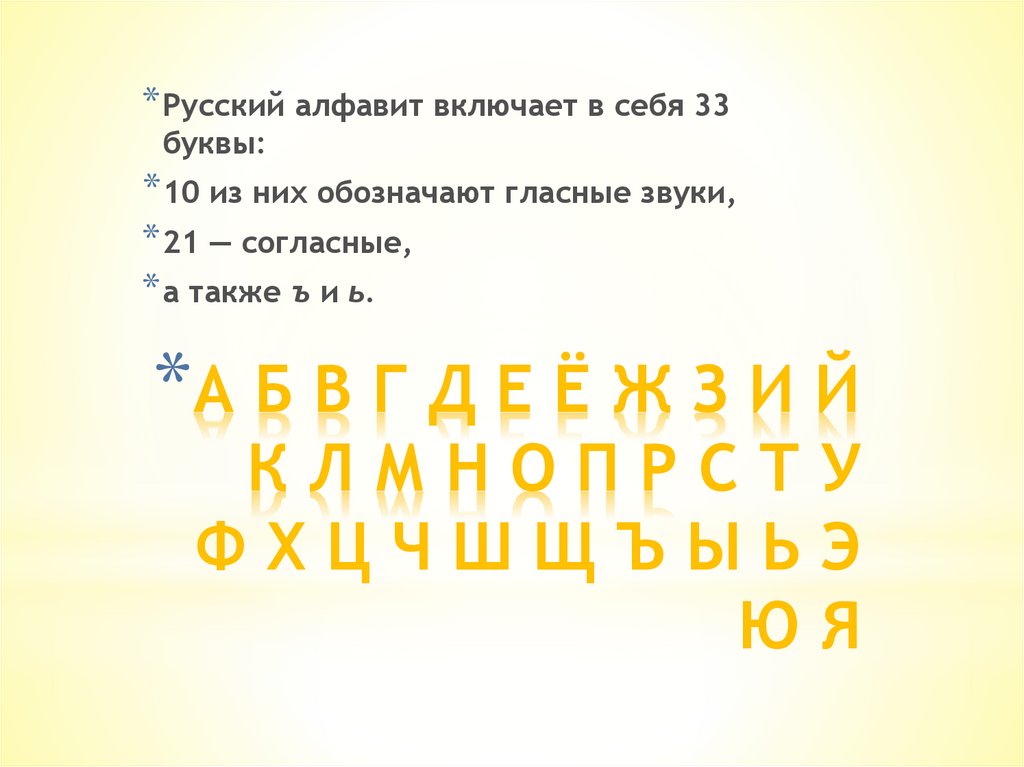 * Русский алфавит включает в себя 33буквы: