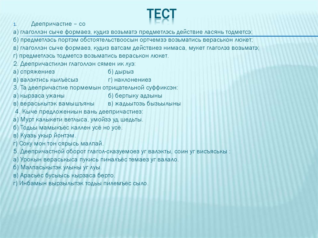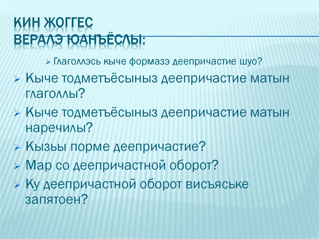 5. Деепричастной оборот глагол-сказуемоез уг валэкты, соин уг висъяськы :
