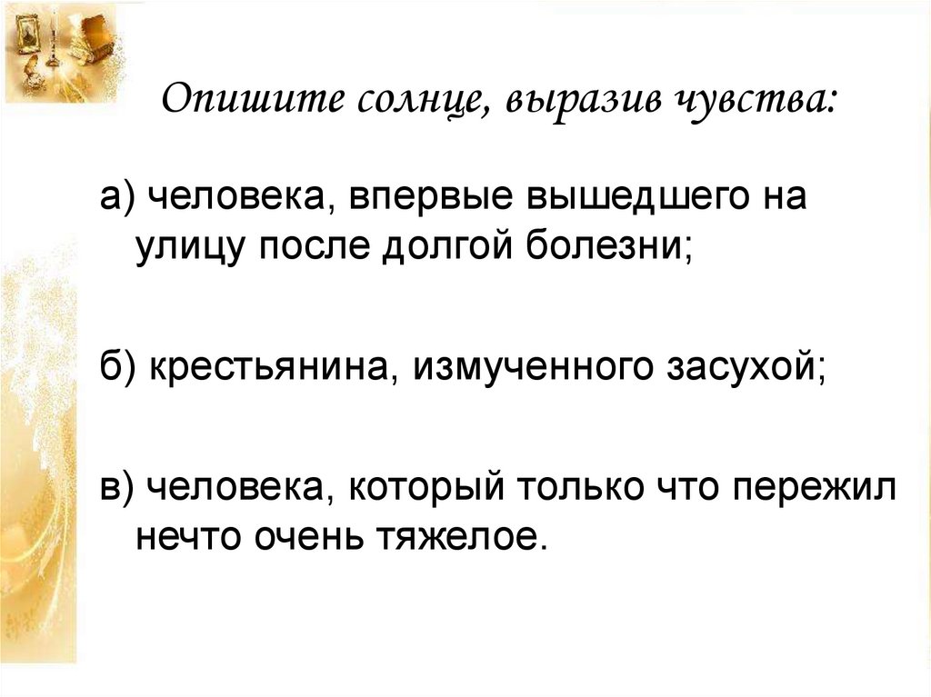 Опишите солнце, выразив чувства:а) человека, впервые вышедшего на