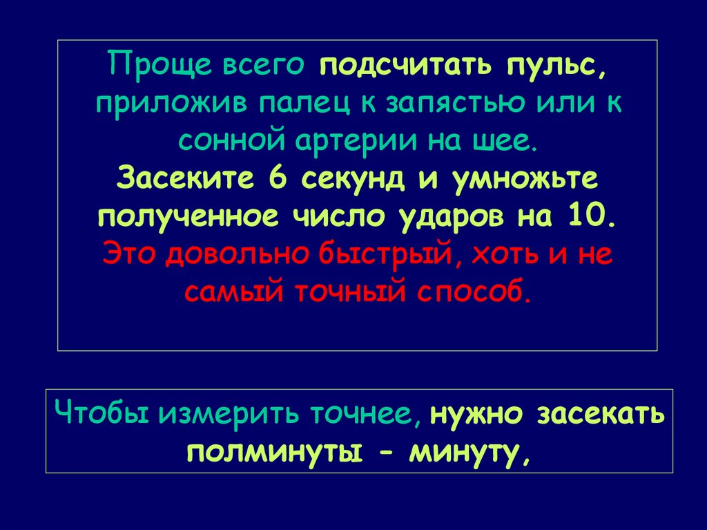 Проще всего подсчитать пульс,приложив палец к запястью или к