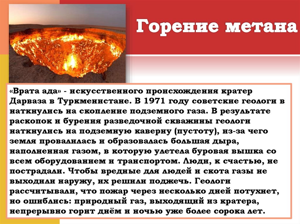 «Врата ада» - искусственного происхождения кратерДарваза в Туркменистане. В 1971 году советские геологи в