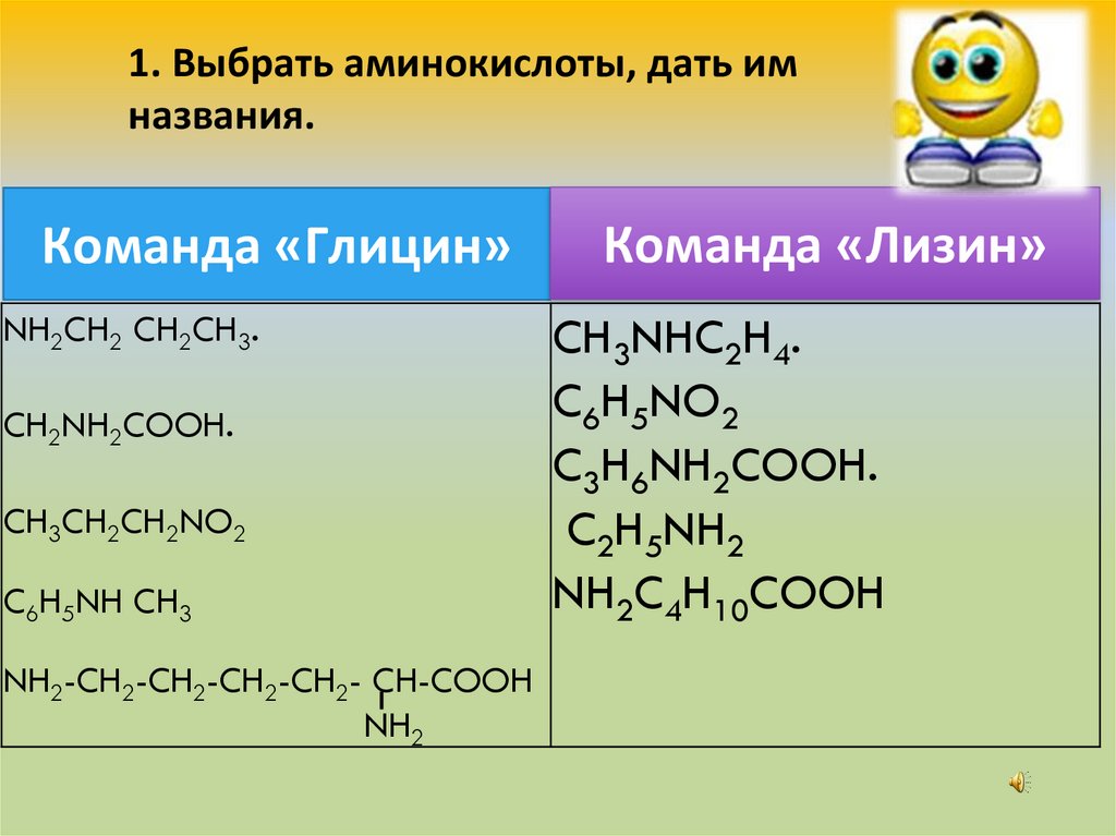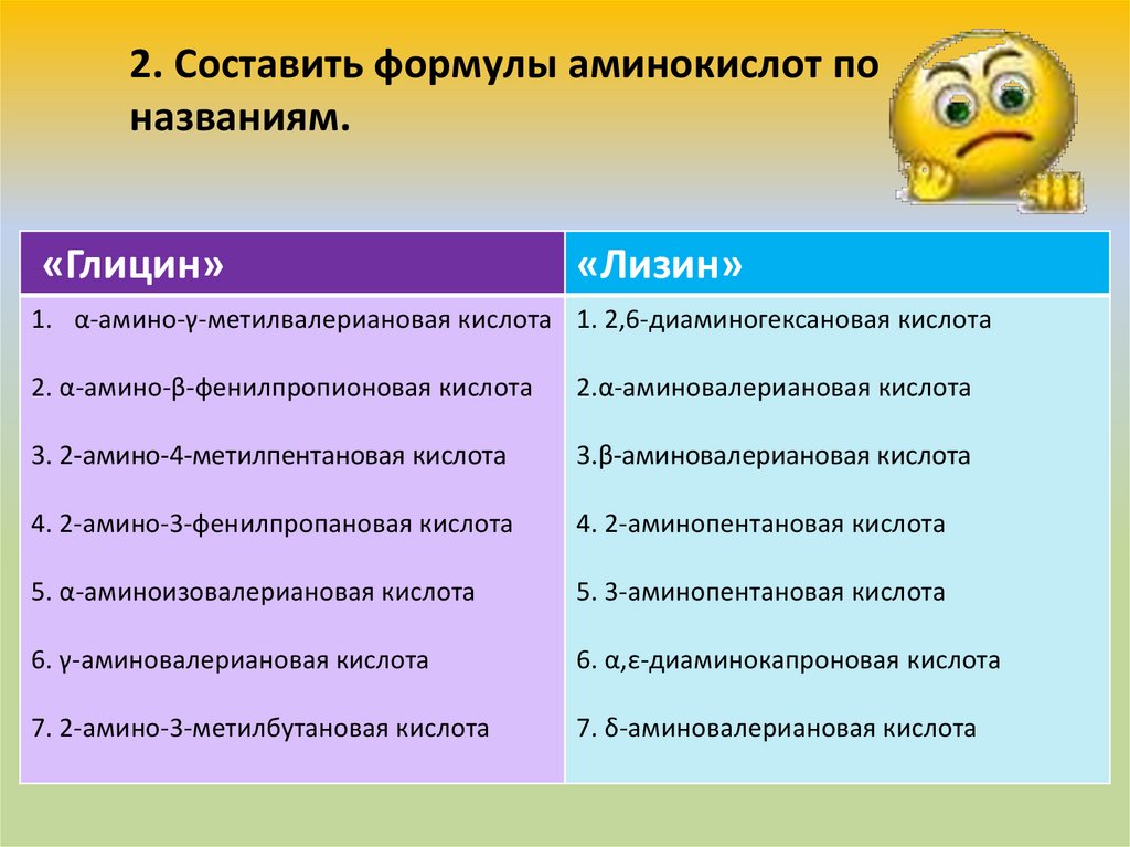 1. α-амино-γ-метилвалериановая кислота 1. 2,6-диаминогексановая кислота