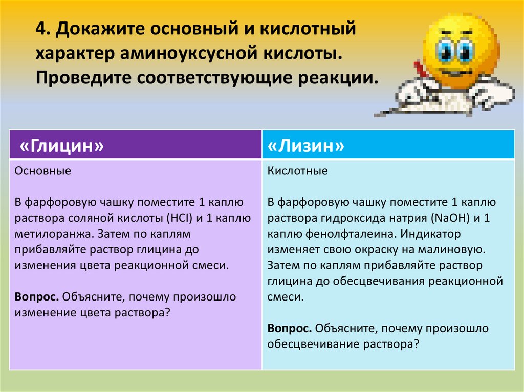 4. Докажите основный и кислотныйхарактер аминоуксусной кислоты.
