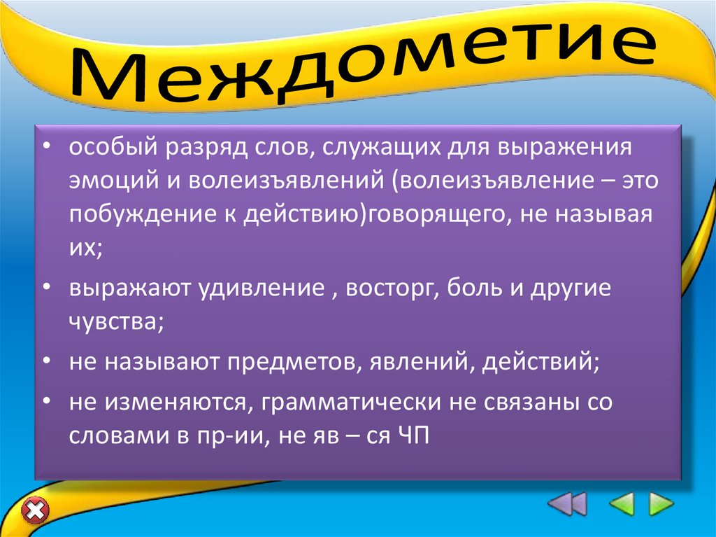 • особый разряд слов, служащих для выраженияэмоций и волеизъявлений (волеизъявление – это