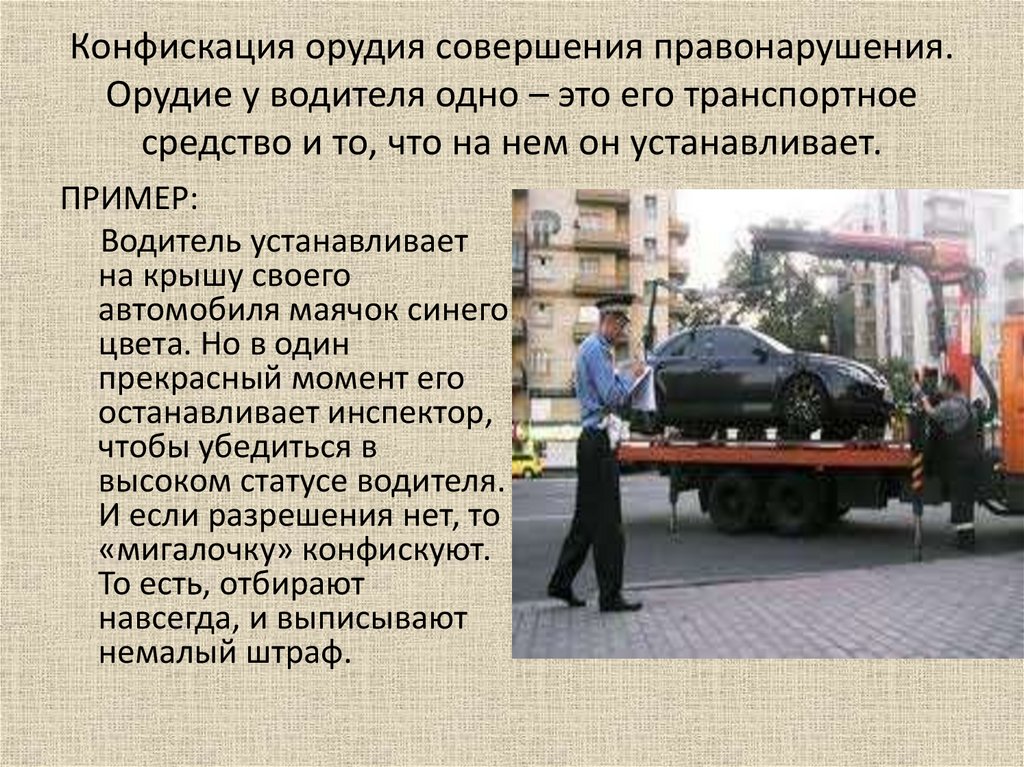 Конфискация орудия совершения правонарушения.Орудие у водителя одно – это его транспортное