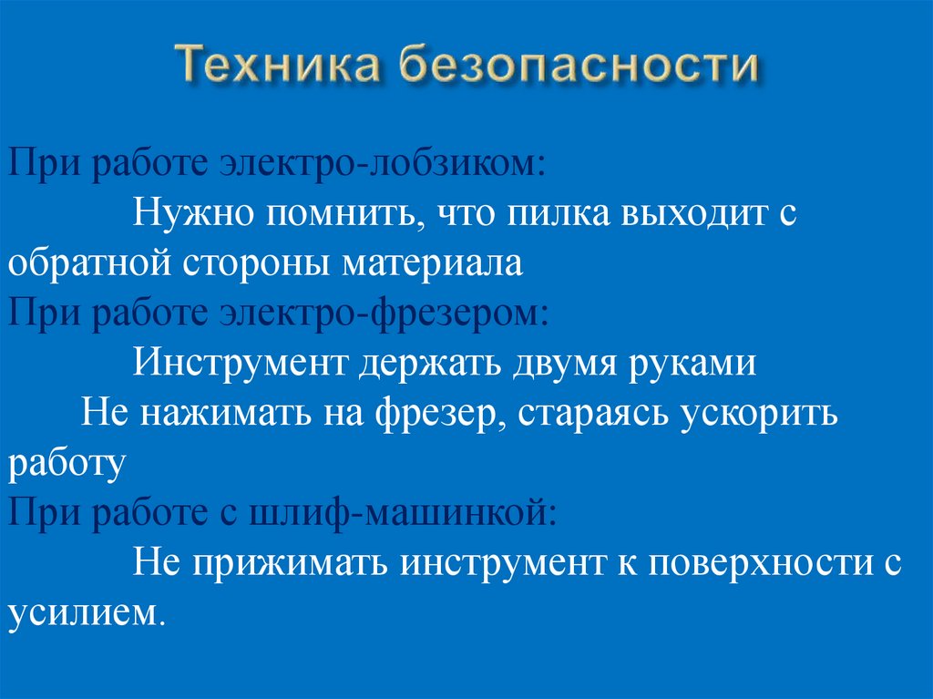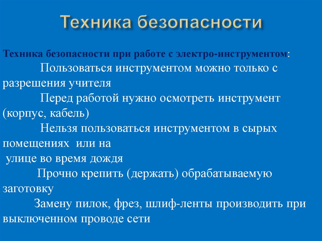 Техника безопасности при работе с электро-инструментом:Пользоваться инструментом можно только с