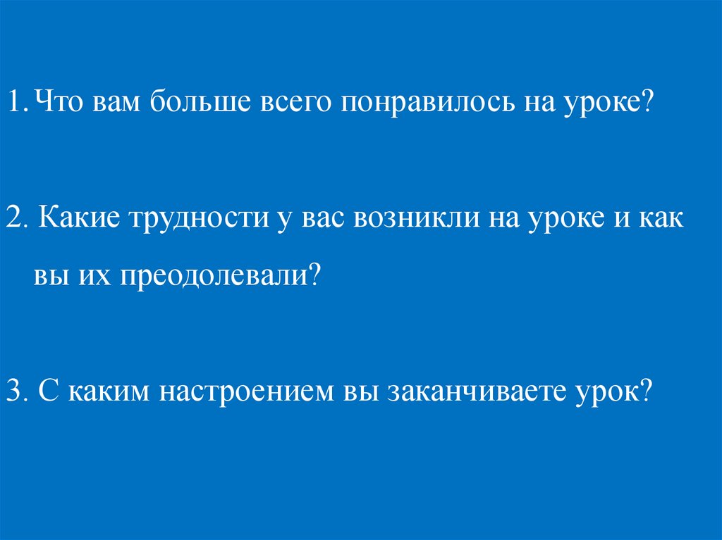 1.Что вам больше всего понравилось на уроке?2. Какие трудности у вас возникли на уроке и как