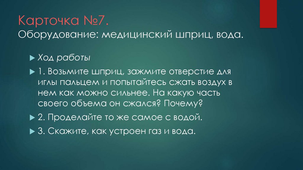 Карточка №7.Оборудование: медицинский шприц, вода.