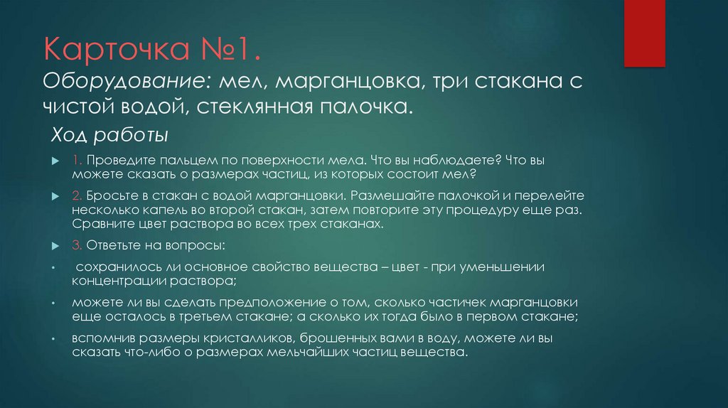 Карточка №1.Оборудование: мел, марганцовка, три стакана с