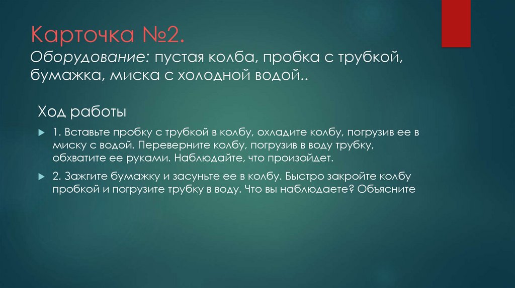 Карточка №2.Оборудование: пустая колба, пробка с трубкой,